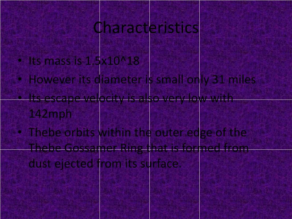 Characteristics • Its mass is 1.5x10^18 • However its diameter is small only 31 miles • Its escape velocity is also very low with 142mph • Thebe orbits within the outer edge of the Thebe Gossamer Ring that is formed from dust ejected from its surface.