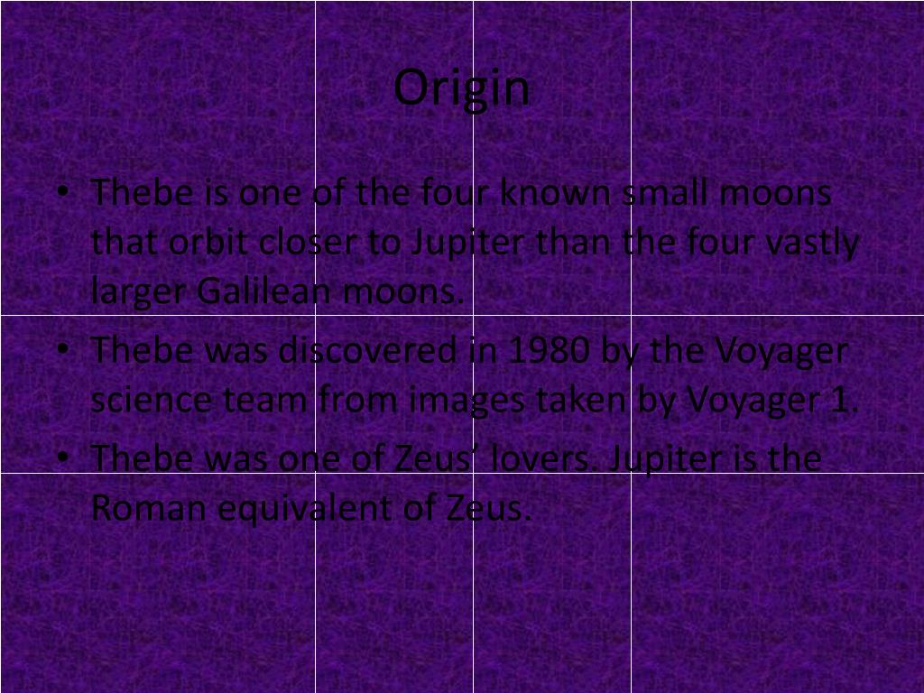 Origin • Thebe is one of the four known small moons that orbit closer to Jupiter than the four vastly larger Galilean moons. • Thebe was discovered in 1980 by the Voyager science team from images taken by Voyager 1. • Thebe was one of Zeus’ lovers. Jupiter is the Roman equivalent of Zeus.