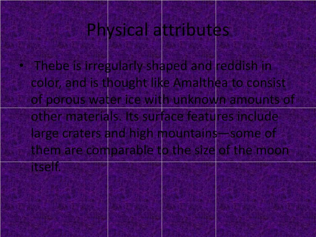 Physical attributes • Thebe is irregularly shaped and reddish in color, and is thought like Amalthea to consist of porous water ice with unknown amounts of other materials. Its surface features include large craters and high mountains—some of them are comparable to the size of the moon itself.