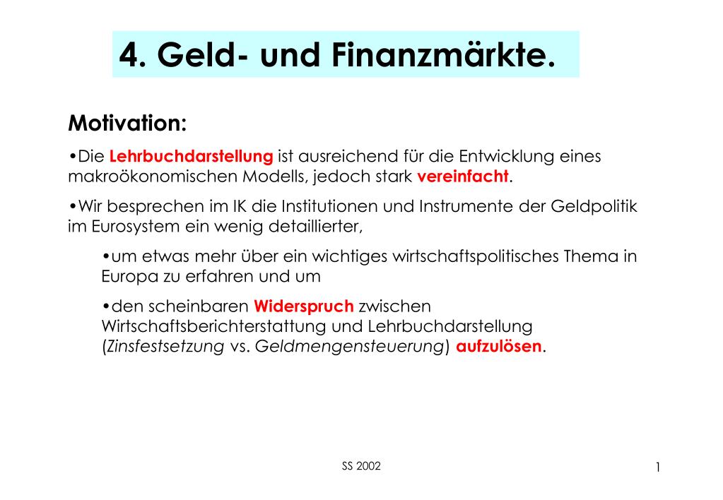 4. Geld- und Finanzmärkte. • Motivation: • Die Lehrbuchdarstellung ist ausreichend für die Entwicklung eines makroökonomischen Modells, jedoch stark vereinfacht. • Wir besprechen im IK die Institutionen und Instrumente der Geldpolitik im Eurosystem ein wenig detaillierter, • um etwas mehr über ein wichtiges wirtschaftspolitisches Thema in Europa zu erfahren und um • den scheinbaren Widerspruch zwischen Wirtschaftsberichterstattung und Lehrbuchdarstellung (Zinsfestsetzung vs. Geldmengensteuerung) aufzulösen. SS 2002