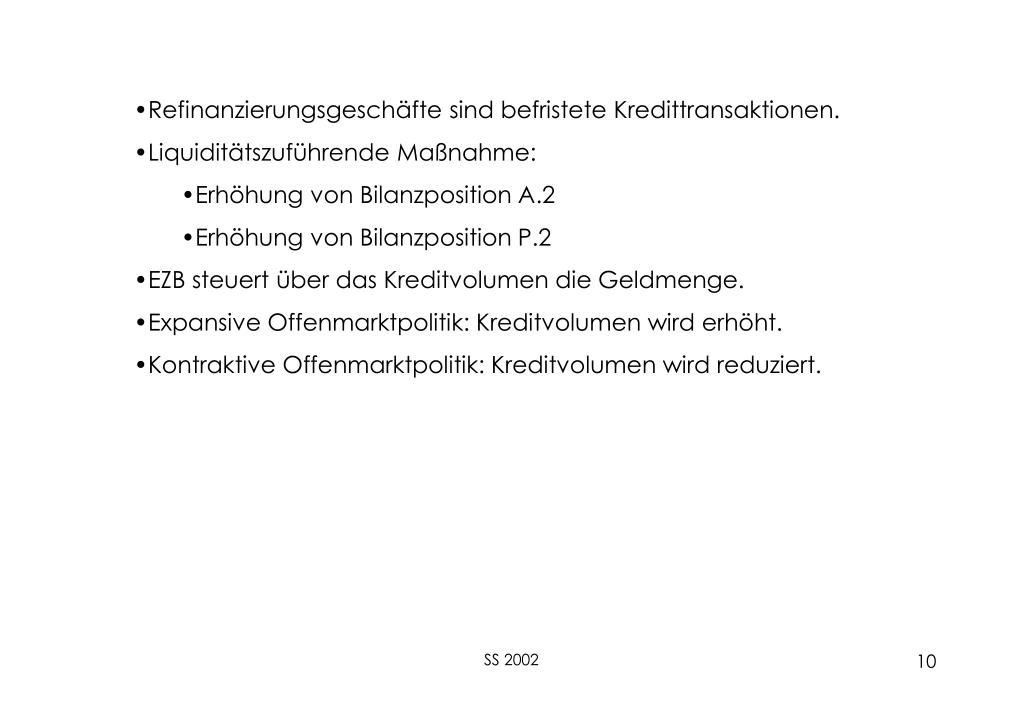 Refinanzierungsgeschäfte sind befristete Kredittransaktionen. • Liquiditätszuführende Maßnahme: • Erhöhung von Bilanzposition A.2 • Erhöhung von Bilanzposition P.2 • EZB steuert über das Kreditvolumen die Geldmenge. • Expansive Offenmarktpolitik: Kreditvolumen wird erhöht. • Kontraktive Offenmarktpolitik: Kreditvolumen wird reduziert. SS 2002