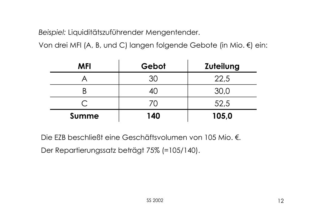 Beispiel: LiquiditätszuführenderMengentender. Von drei MFI (A, B, und C) langen folgende Gebote (in Mio. €) ein: Die EZB beschließt eine Geschäftsvolumen von 105 Mio. €. Der Repartierungssatz beträgt 75% (=105/140). SS 2002