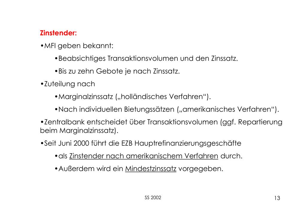 Zinstender: • MFI geben bekannt: • Beabsichtiges Transaktionsvolumen und den Zinssatz. • Bis zu zehn Gebote je nach Zinssatz. • Zuteilung nach • Marginalzinssatz („holländisches Verfahren“). • Nach individuellen Bietungssätzen („amerikanisches Verfahren“). • Zentralbank entscheidet über Transaktionsvolumen (ggf. Repartierung beim Marginalzinssatz). • Seit Juni 2000 führt die EZB Hauptrefinanzierungsgeschäfte • als Zinstender nach amerikanischem Verfahren durch. • Außerdem wird ein Mindestzinssatz vorgegeben. SS 2002