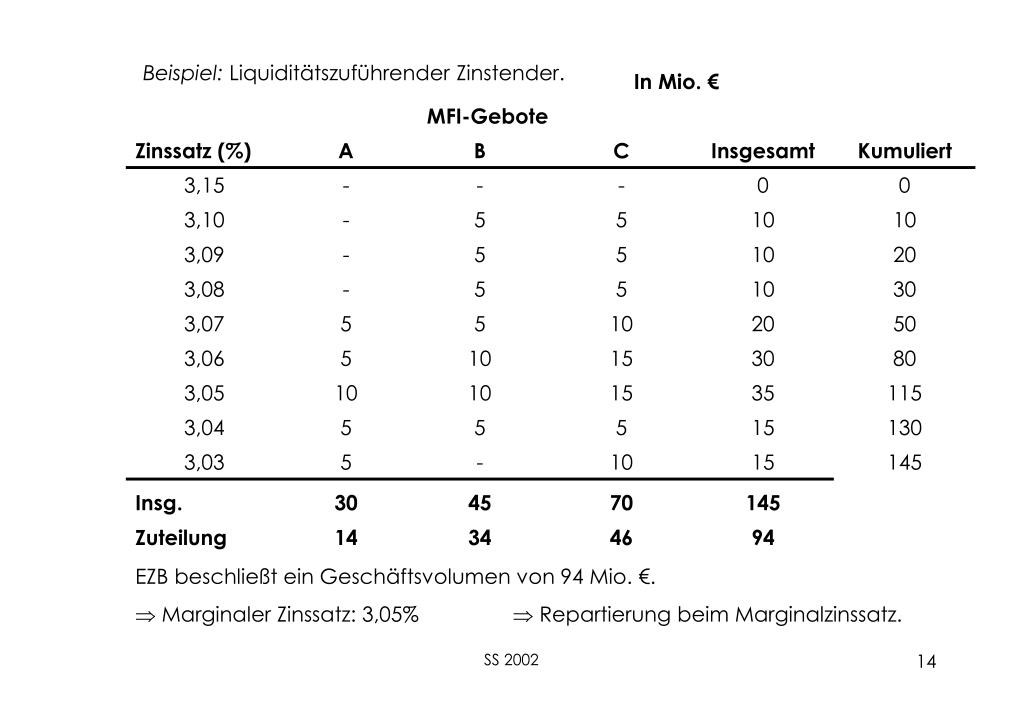 Beispiel: Liquiditätszuführender Zinstender. EZB beschließt ein Geschäftsvolumen von 94 Mio. €. Marginaler Zinssatz: 3,05% Repartierung beim Marginalzinssatz. SS 2002