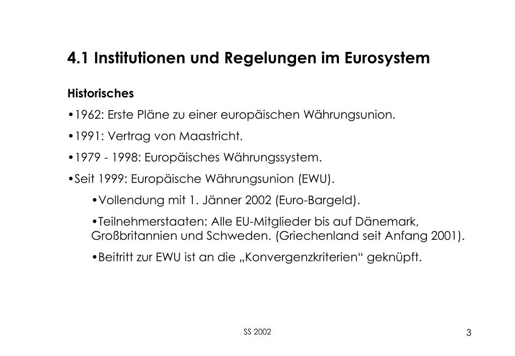 4.1 Institutionen und Regelungen im Eurosystem • Historisches • 1962: Erste Pläne zu einer europäischen Währungsunion. • 1991: Vertrag von Maastricht. • 1979 - 1998: Europäisches Währungssystem. • Seit 1999: Europäische Währungsunion (EWU). • Vollendung mit 1. Jänner 2002 (Euro-Bargeld). • Teilnehmerstaaten: Alle EU-Mitglieder bis auf Dänemark, Großbritannien und Schweden. (Griechenland seit Anfang 2001). • Beitritt zur EWU ist an die „Konvergenzkriterien“ geknüpft. SS 2002