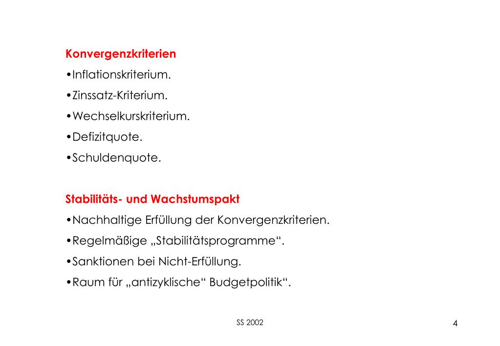Konvergenzkriterien • Inflationskriterium. • Zinssatz-Kriterium. • Wechselkurskriterium. • Defizitquote. • Schuldenquote. • Stabilitäts- und Wachstumspakt • Nachhaltige Erfüllung der Konvergenzkriterien. • Regelmäßige „Stabilitätsprogramme“. • Sanktionen bei Nicht-Erfüllung. • Raum für „antizyklische“ Budgetpolitik“. SS 2002