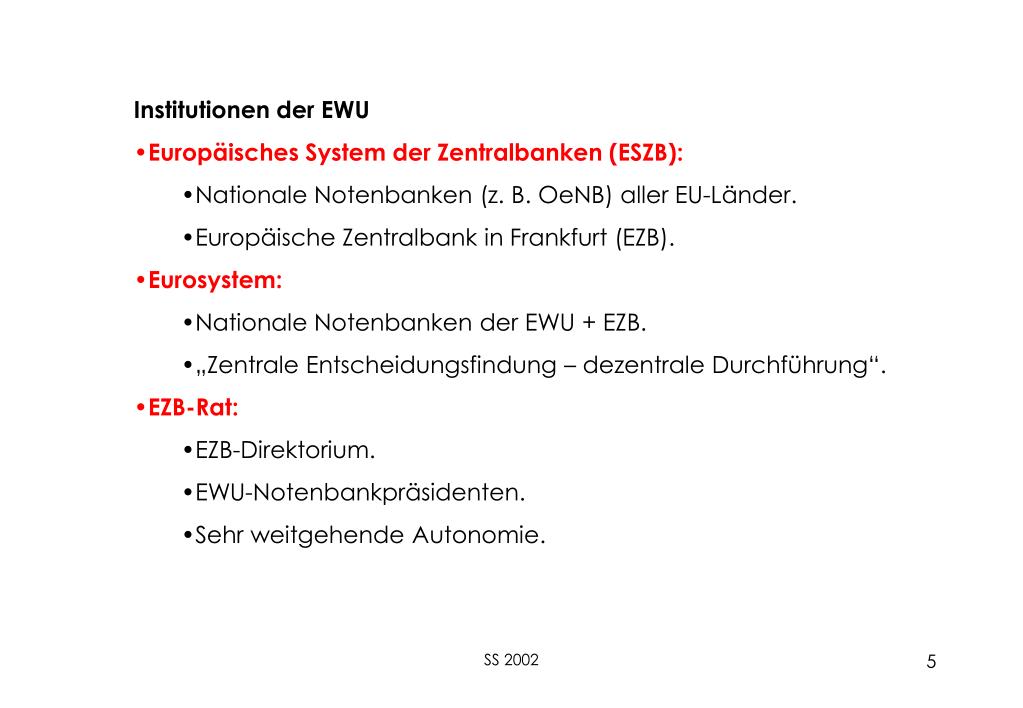 Institutionen der EWU • Europäisches System der Zentralbanken (ESZB): • Nationale Notenbanken (z. B. OeNB) aller EU-Länder. • Europäische Zentralbank in Frankfurt (EZB). • Eurosystem: • Nationale Notenbanken der EWU + EZB. • „Zentrale Entscheidungsfindung – dezentrale Durchführung“. • EZB-Rat: • EZB-Direktorium. • EWU-Notenbankpräsidenten. • Sehr weitgehende Autonomie. SS 2002