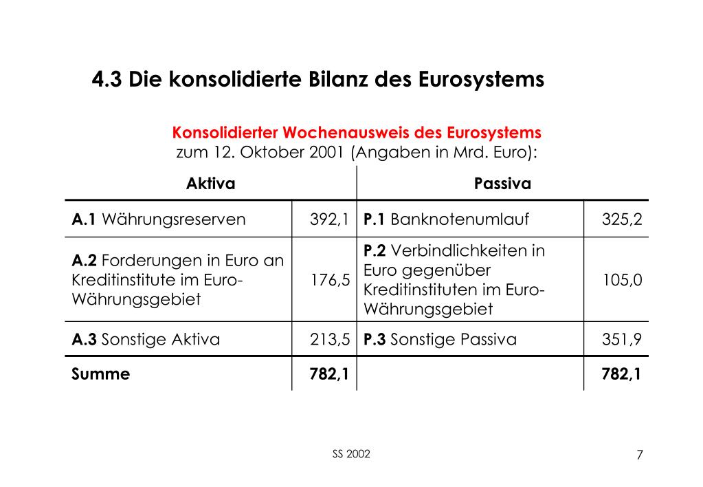 Inhalt • Institutionen und Regelungen im Eurosystem. • Aufgaben des Eurosystems. • Die konsolidierte Bilanz des Eurosystems. • Geldpolitische Instrumente der Europäischen Zentralbank. • Geldmengendefinitionen im Eurosystem. SS 2002