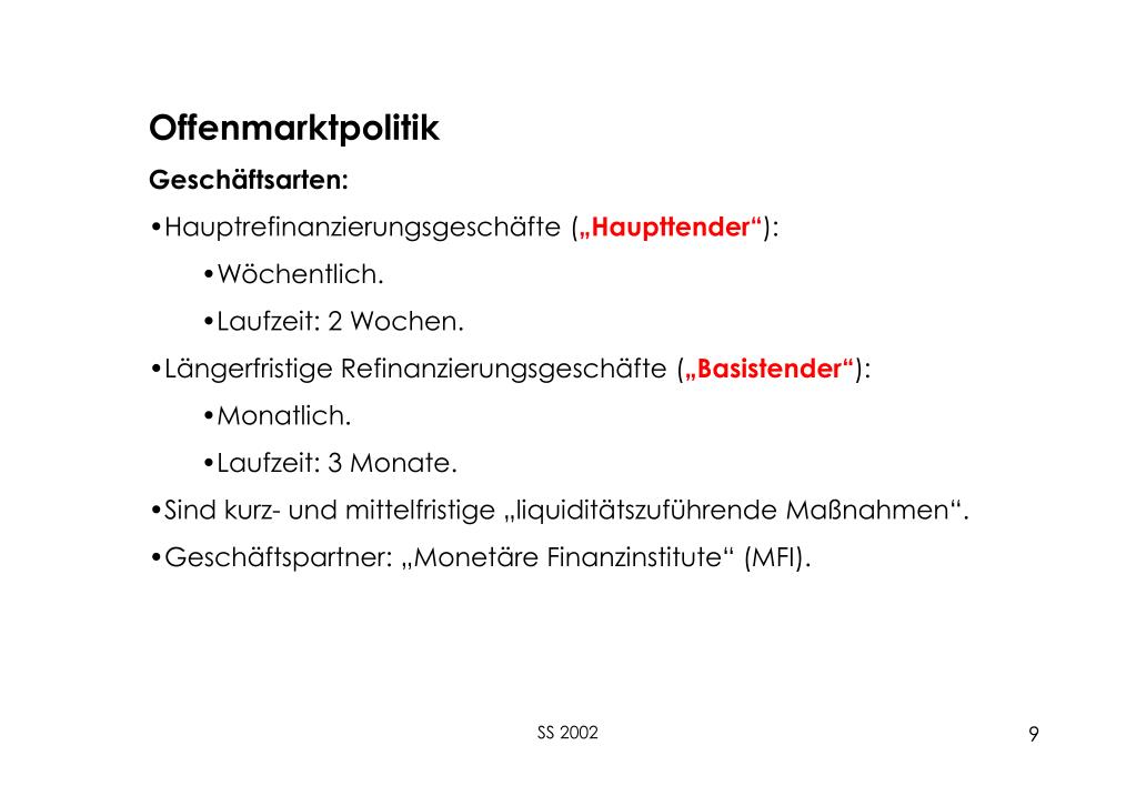 Offenmarktpolitik • Geschäftsarten: • Hauptrefinanzierungsgeschäfte („Haupttender“): • Wöchentlich. • Laufzeit: 2 Wochen. • Längerfristige Refinanzierungsgeschäfte („Basistender“): • Monatlich. • Laufzeit: 3 Monate. • Sind kurz- und mittelfristige „liquiditätszuführende Maßnahmen“. • Geschäftspartner: „Monetäre Finanzinstitute“ (MFI). SS 2002