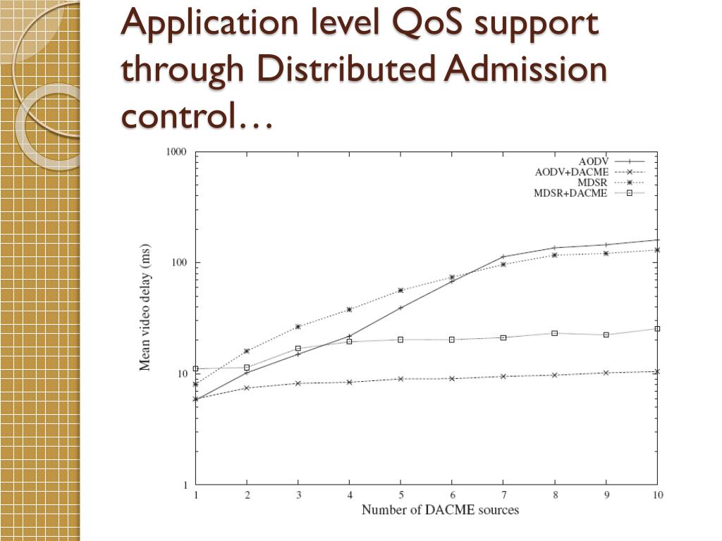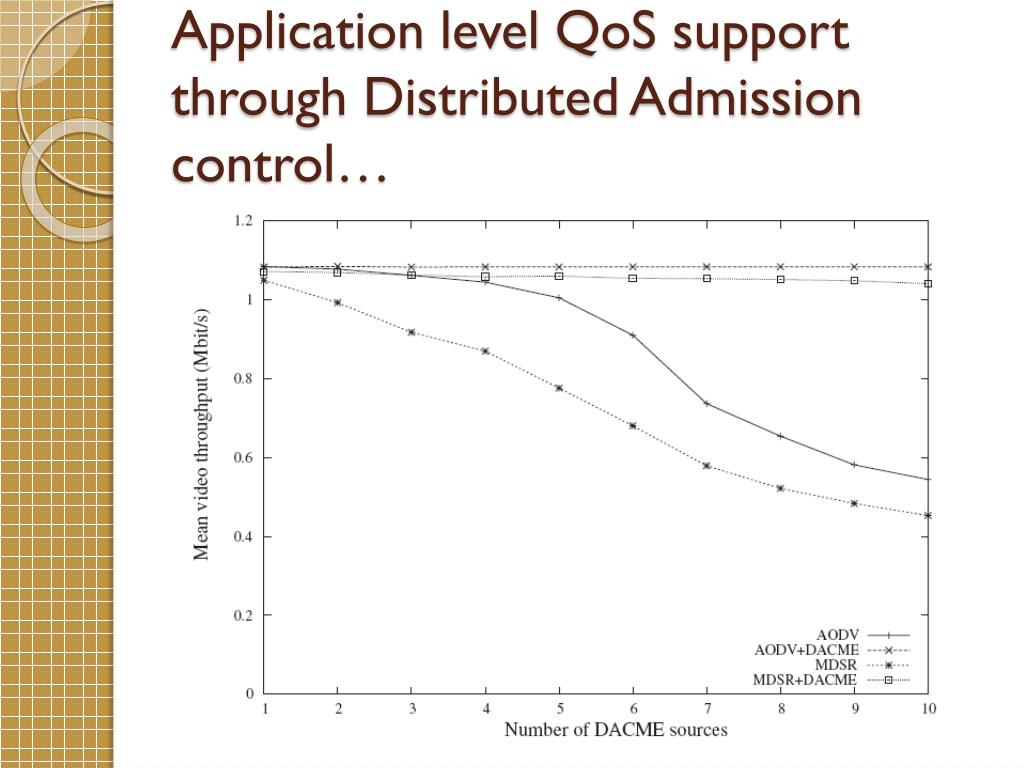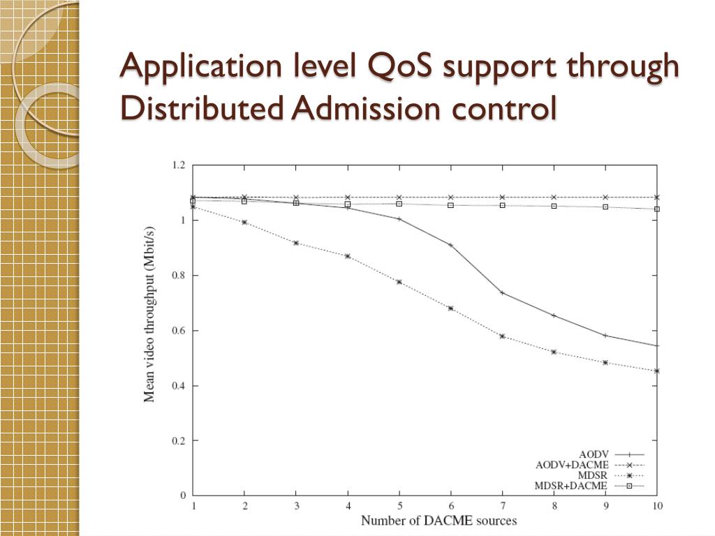 DACME…. • Interaction with Routing Protocols • RREP • Multipath DSR • Interaction with IEEE 802.11e Layer • Probing packets with Video Access Priority • Contention-free bursting turned off