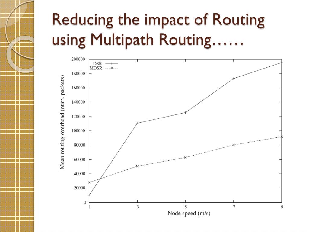 Routing in MANETs • Required for Optimum Performance • Highly responsive to Interruptions • Should detect Path Losses • Should be able to find new Paths ASAP • MDSR – Multipath Extension to DSR • Integration of route discovery & assignment • Maximum path disjointness under low additional routing load