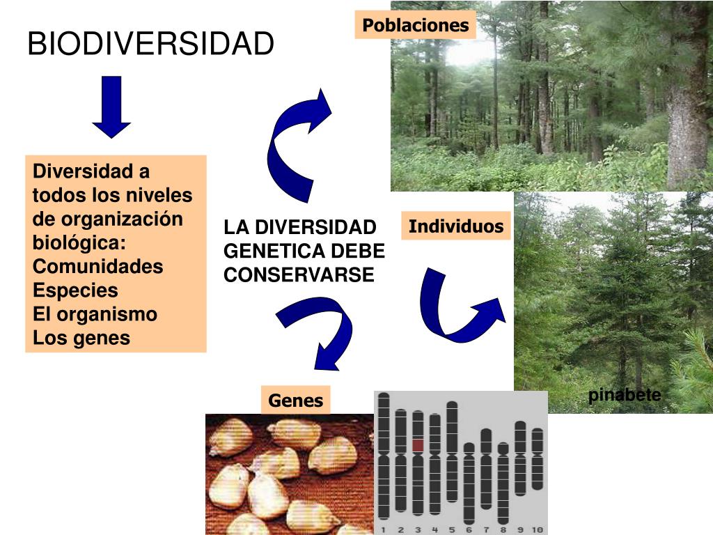 Poblaciones BIODIVERSIDAD Diversidad a todos los niveles de organización biológica: Comunidades Especies El organismo Los genes LA DIVERSIDAD GENETICA DEBE CONSERVARSE Individuos pinabete Genes