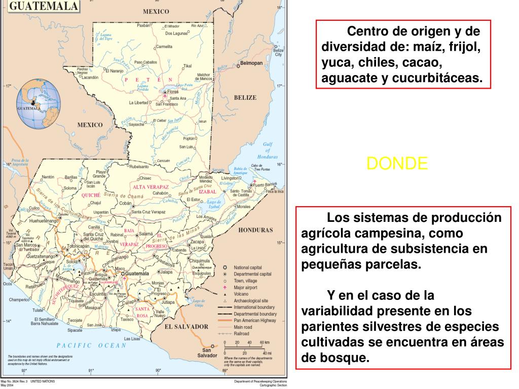 Centro de origen y de diversidad de: maíz, frijol, yuca, chiles, cacao, aguacate y cucurbitáceas. DONDE Los sistemas de producción agrícola campesina, como agricultura de subsistencia en pequeñas parcelas. Y en el caso de la variabilidad presente en los parientes silvestres de especies cultivadas se encuentra en áreas de bosque.