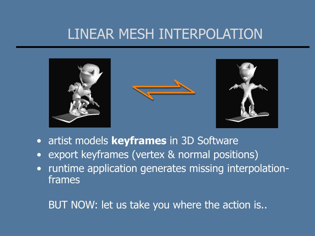 LINEAR MESH INTERPOLATION • artist models keyframes in 3D Software • export keyframes (vertex & normal positions) • runtime application generates missing interpolation-frames BUT NOW: let us take you where the action is..