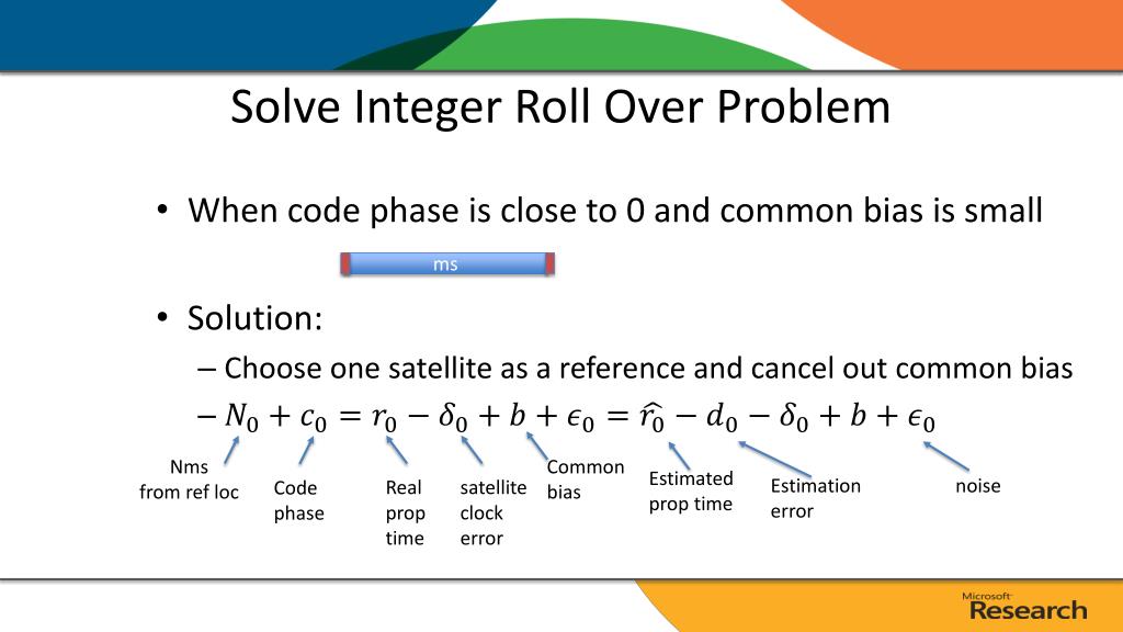 Solve Integer Roll Over Problem • When code phase is close to 0 and common bias is small • Solution: • Choose one satellite as a reference and cancel out common bias ms Nmsfrom ref loc Commonbias Estimatedprop time Estimation error noise Realproptime satelliteclock error Code phase