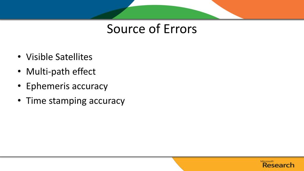 Source of Errors • Visible Satellites • Multi-path effect • Ephemeris accuracy • Time stamping accuracy