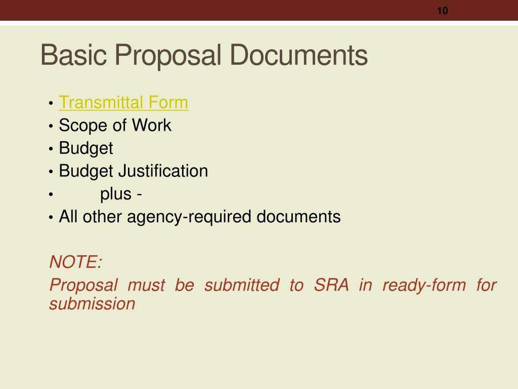 Basic Proposal Documents • Transmittal Form • Scope of Work • Budget • Budget Justification • plus - • All other agency-required documents NOTE: Proposal must be submitted to SRA in ready-form for submission