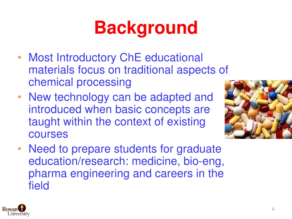 Background • Most Introductory ChE educational materials focus on traditional aspects of chemical processing • New technology can be adapted and introduced when basic concepts are taught within the context of existing courses • Need to prepare students for graduate education/research: medicine, bio-eng, pharma engineering and careers in the field