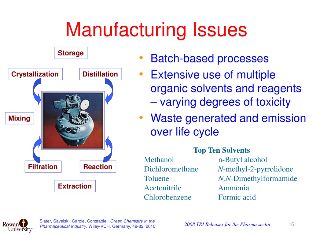 Manufacturing Issues Storage • Batch-based processes • Extensive use of multiple organic solvents and reagents – varying degrees of toxicity • Waste generated and emission over life cycle Crystallization Distillation Mixing Top Ten Solvents Methanol n-Butyl alcohol Dichloromethane N-methyl-2-pyrrolidone Toluene N,N-Dimethylformamide Acetonitrile Ammonia ChlorobenzeneFormic acid Filtration Reaction Extraction Slater, Savelski, Carole, Constable, Green Chemistry in the Pharmaceutical Industry, Wiley-VCH, Germany, 49-82, 2010 2008 TRI Releases for the Pharma sector