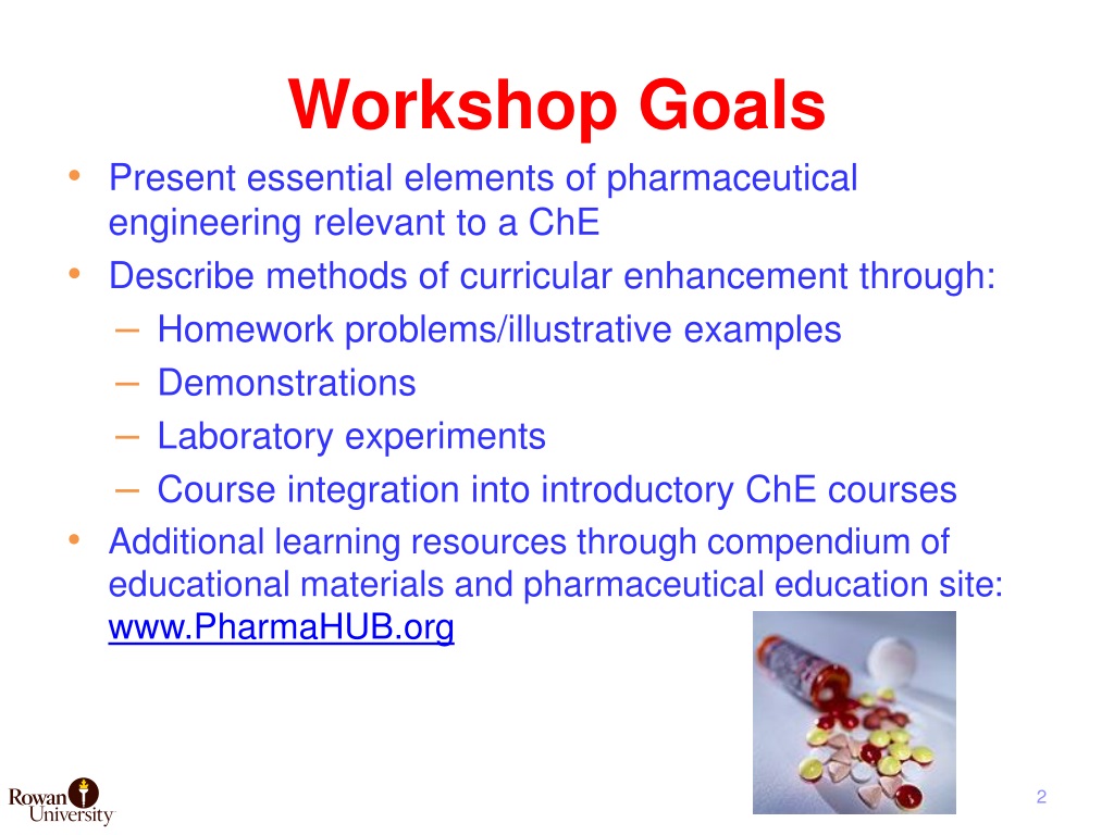 Workshop Goals • Present essential elements of pharmaceutical engineering relevant to a ChE • Describe methods of curricular enhancement through: • Homework problems/illustrative examples • Demonstrations • Laboratory experiments • Course integration into introductory ChE courses • Additional learning resources through compendium of educational materials and pharmaceutical education site: www.PharmaHUB.org