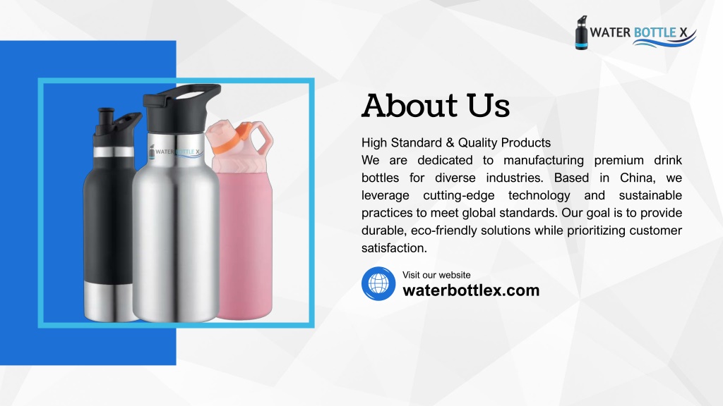 About Us High Standard & Quality Products We are dedicated to manufacturing premium drink bottles for diverse industries. Based in China, we leverage cutting-edge technology and sustainable practices to meet global standards. Our goal is to provide durable, eco-friendly solutions while prioritizing customer satisfaction. Visit our website waterbottlex.com