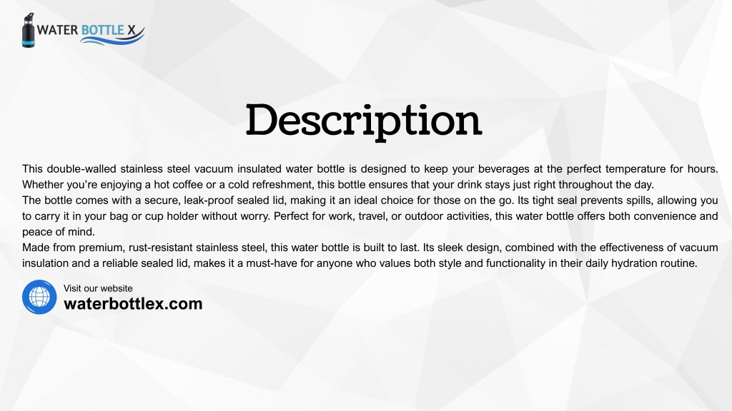 Description This double-walled stainless steel vacuum insulated water bottle is designed to keep your beverages at the perfect temperature for hours. Whether you’re enjoying a hot coffee or a cold refreshment, this bottle ensures that your drink stays just right throughout the day. The bottle comes with a secure, leak-proof sealed lid, making it an ideal choice for those on the go. Its tight seal prevents spills, allowing you to carry it in your bag or cup holder without worry. Perfect for work, travel, or outdoor activities, this water bottle offers both convenience and peace of mind. Made from premium, rust-resistant stainless steel, this water bottle is built to last. Its sleek design, combined with the effectiveness of vacuum insulation and a reliable sealed lid, makes it a must-have for anyone who values both style and functionality in their daily hydration routine. Visit our website waterbottlex.com