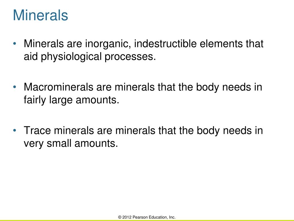 Minerals • Minerals are inorganic, indestructible elements that aid physiological processes. • Macrominerals are minerals that the body needs in fairly large amounts. • Trace minerals are minerals that the body needs in very small amounts.