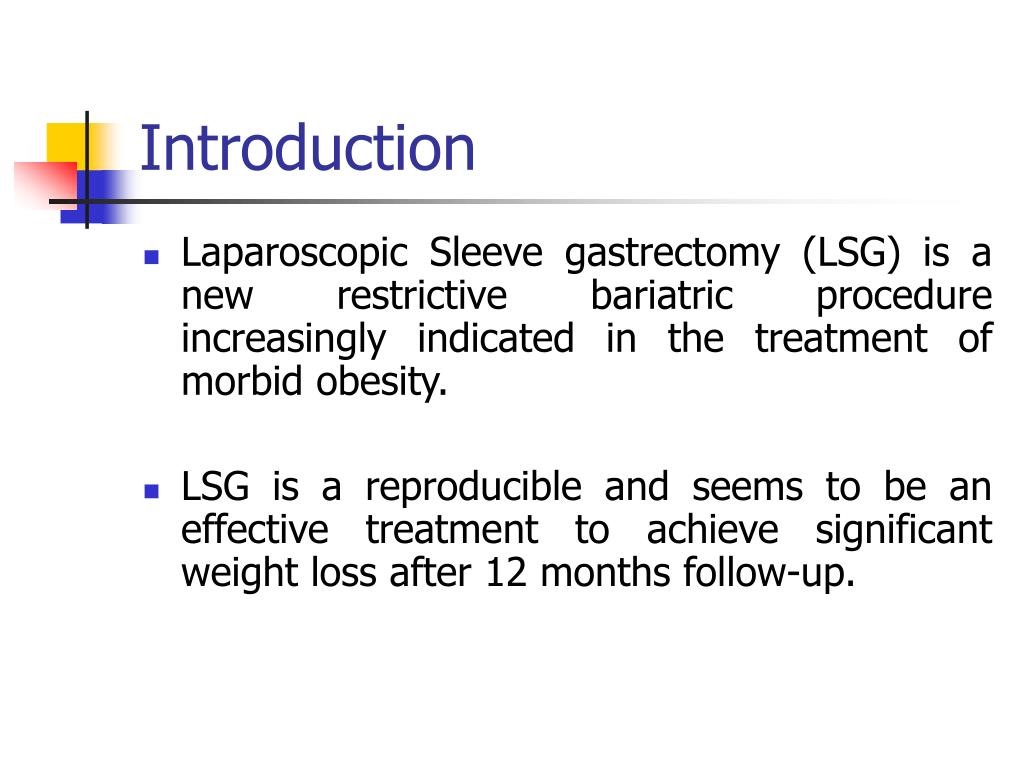 Introduction • Laparoscopic Sleeve gastrectomy (LSG) is a new restrictive bariatric procedure increasingly indicated in the treatment of morbid obesity. • LSG is a reproducible and seems to be an effective treatment to achieve significant weight loss after 12 months follow-up.