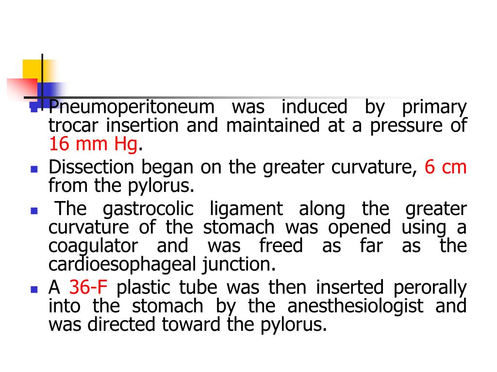 Pneumoperitoneum was induced by primary trocar insertion and maintained at a pressure of 16 mm Hg. • Dissection began on the greater curvature, 6 cm from the pylorus. • The gastrocolic ligament along the greater curvature of the stomach was opened using a coagulator and was freed as far as the cardioesophageal junction. • A 36-F plastic tube was then inserted perorally into the stomach by the anesthesiologist and was directed toward the pylorus.