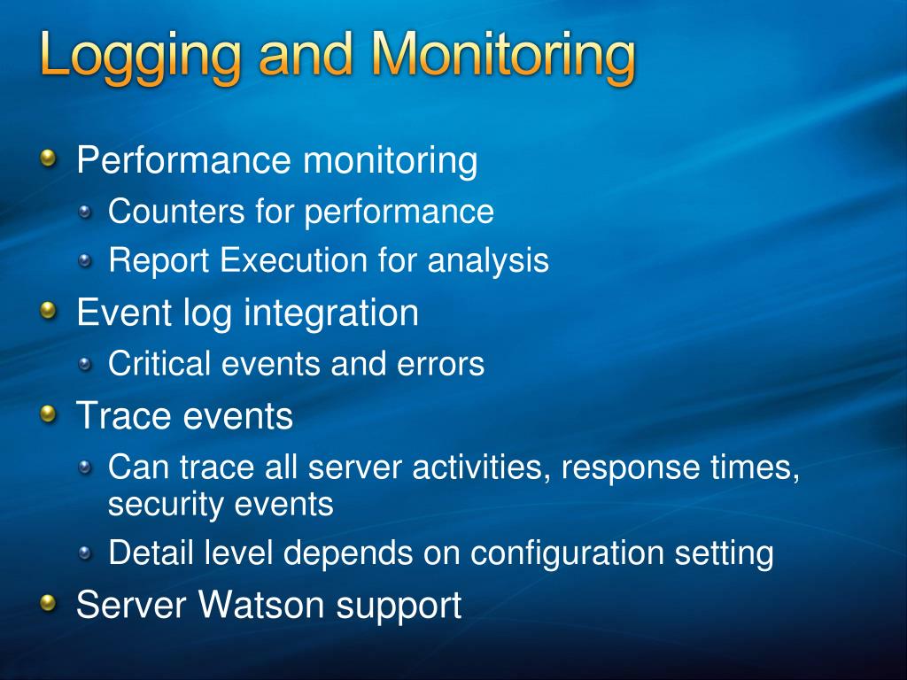 Logging and Monitoring • Performance monitoring • Counters for performance • Report Execution for analysis • Event log integration • Critical events and errors • Trace events • Can trace all server activities, response times, security events • Detail level depends on configuration setting • Server Watson support