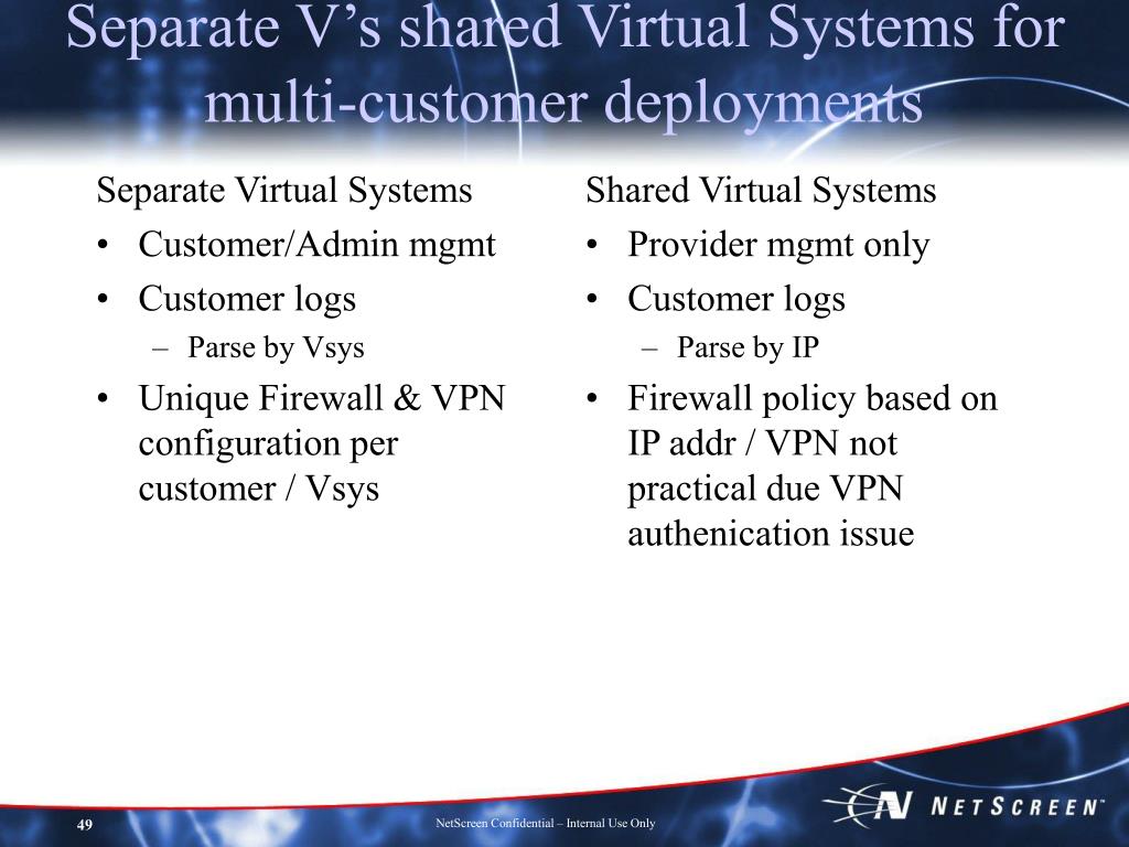Separate Virtual Systems Customer/Admin mgmt Customer logs Parse by Vsys Unique Firewall & VPN configuration per customer / Vsys Shared Virtual Systems Provider mgmt only Customer logs Parse by IP Firewall policy based on IP addr / VPN not practical due VPN authenication issue Separate V’s shared Virtual Systems for multi-customer deployments