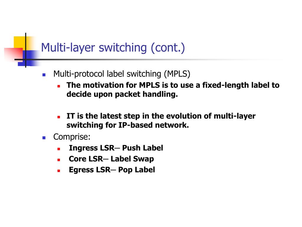 Multi-layer switching (cont.) • Multi-protocol label switching (MPLS) • The motivation for MPLS is to use a fixed-length label to decide upon packet handling. • IT is the latest step in the evolution of multi-layer switching for IP-based network. • Comprise: • Ingress LSR─ Push Label • Core LSR─ Label Swap • Egress LSR─ Pop Label