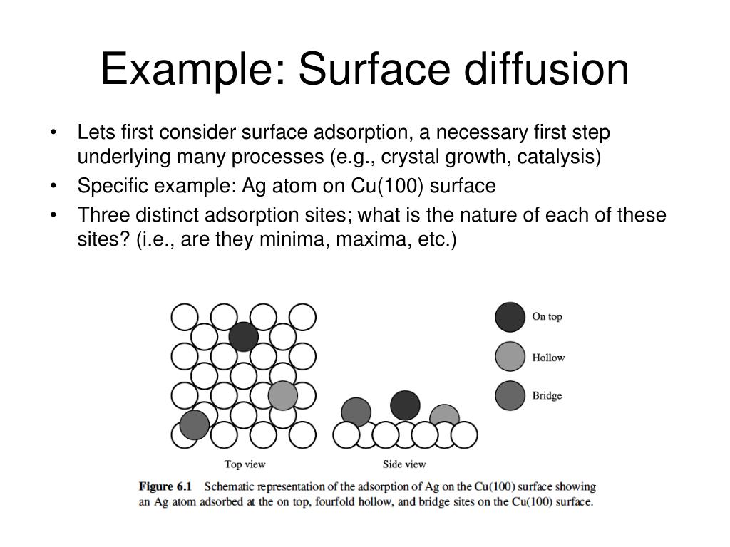 Example: Surface diffusion • Lets first consider surface adsorption, a necessary first step underlying many processes (e.g., crystal growth, catalysis) • Specific example: Ag atom on Cu(100) surface • Three distinct adsorption sites; what is the nature of each of these sites? (i.e., are they minima, maxima, etc.)