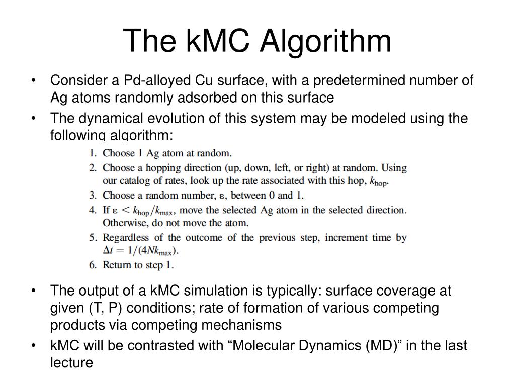The kMC Algorithm • Consider a Pd-alloyed Cu surface, with a predetermined number of Ag atoms randomly adsorbed on this surface • The dynamical evolution of this system may be modeled using the following algorithm: • The output of a kMC simulation is typically: surface coverage at given (T, P) conditions; rate of formation of various competing products via competing mechanisms • kMC will be contrasted with “Molecular Dynamics (MD)” in the last lecture