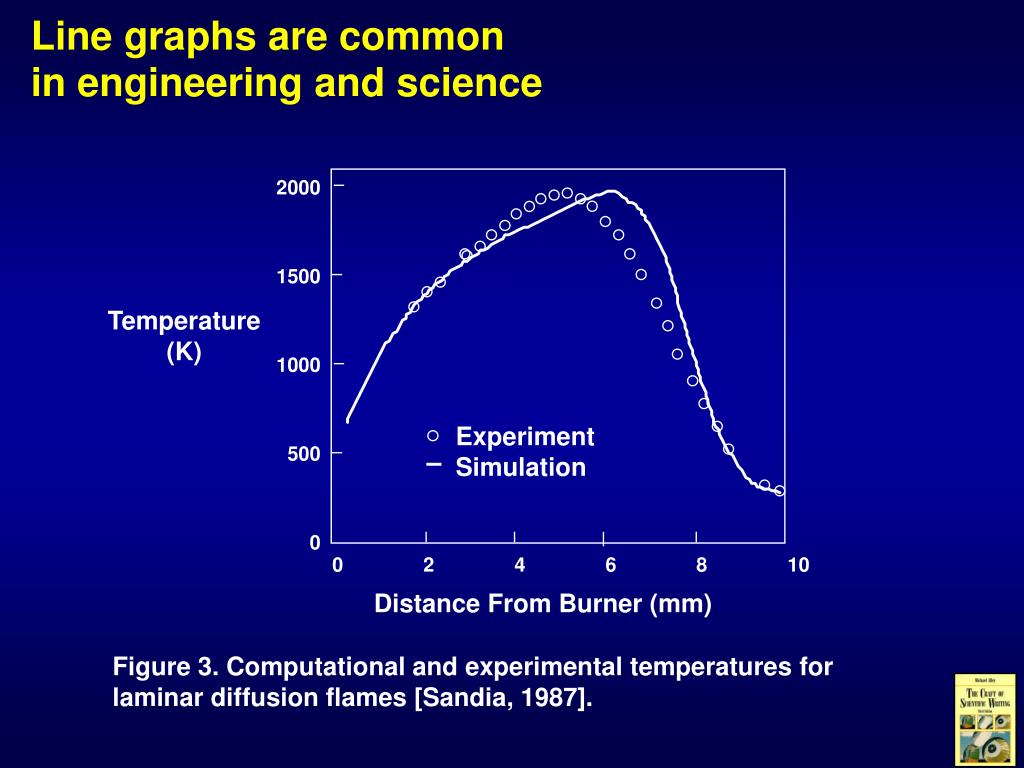2000 1500 1000 500 0 Experiment Simulation 0 2 4 6 8 10 Line graphs are common in engineering and science Temperature (K) Distance From Burner (mm) Figure 3. Computational and experimental temperatures for laminar diffusion flames [Sandia, 1987].