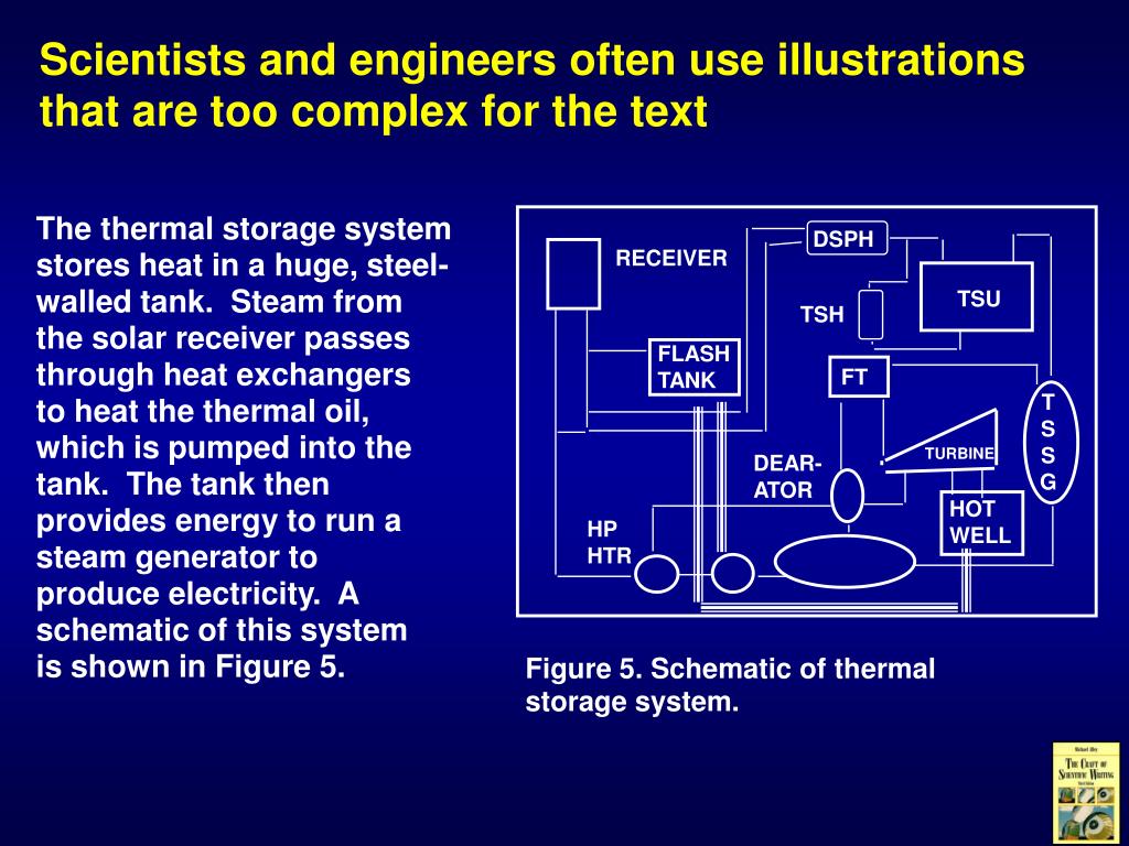 DSPH RECEIVER TSU TSH FLASH TANK FT T S S G TURBINE DEAR- ATOR HOT WELL HP HTR Figure 5. Schematic of thermalstorage system. Scientists and engineers often use illustrationsthat are too complex for the text The thermal storage system stores heat in a huge, steel- walled tank. Steam from the solar receiver passes through heat exchangers to heat the thermal oil, which is pumped into the tank. The tank then provides energy to run a steam generator to produce electricity. A schematic of this system is shown in Figure 5.