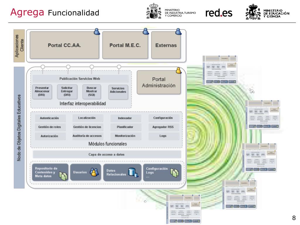 AgregaPremisas de partida • Se crea una federación de nodos • Se gestionan objetos digitales educativos con estándares • Existe un portal para cada CCAA y AGE • Los usuarios realizan mediante herramientas de productividad la gestión de los contenidos • La interfaz y funcionalidad es off-line, on-line • Todas estas interfaces nivel WAI-AA y multilingües