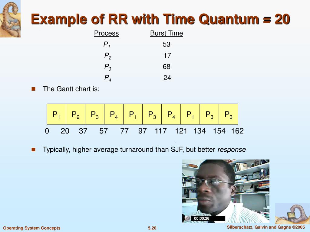 Round Robin (RR) • Each process gets a small unit of CPU time (time quantum), usually 10-100 milliseconds. After this time has elapsed, the process is preempted and added to the end of the ready queue. • If there are n processes in the ready queue and the time quantum is q, then each process gets 1/n of the CPU time in chunks of at most q time units at once. No process waits more than (n-1)q time units. • Performance • q large FIFO • q small q must be large with respect to context switch, otherwise overhead is too high