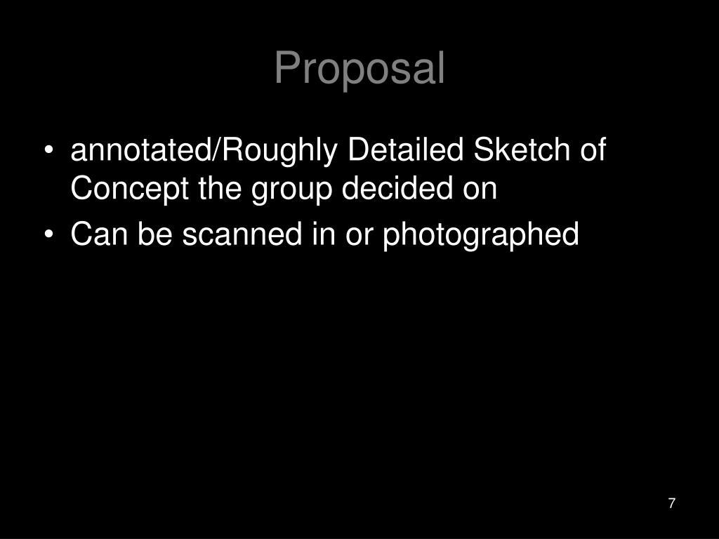 Proposal • annotated/Roughly Detailed Sketch of Concept the group decided on • Can be scanned in or photographed