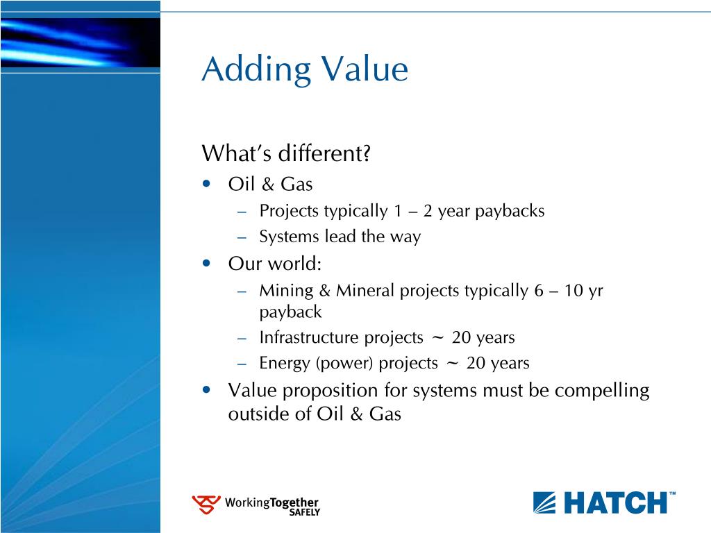 Adding Value What’s different? • Oil & Gas • Projects typically 1 – 2 year paybacks • Systems lead the way • Our world: • Mining & Mineral projects typically 6 – 10 yr payback • Infrastructure projects ~ 20 years • Energy (power) projects ~ 20 years • Value proposition for systems must be compelling outside of Oil & Gas