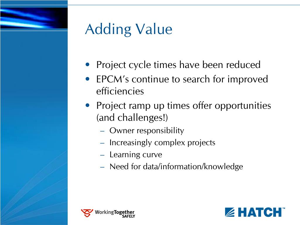 Adding Value • Project cycle times have been reduced • EPCM’s continue to search for improved efficiencies • Project ramp up times offer opportunities (and challenges!) • Owner responsibility • Increasingly complex projects • Learning curve • Need for data/information/knowledge