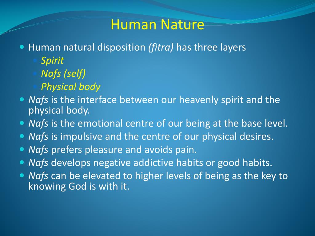 Human natural disposition (fitra) has three layers Spirit Nafs (self) Physical body Nafs is the interface between our heavenly spirit and the physical body. Nafs is the emotional centre of our being at the base level. Nafs is impulsive and the centre of our physical desires. Nafs prefers pleasure and avoids pain. Nafs develops negative addictive habits or good habits. Nafs can be elevated to higher levels of being as the key to knowing God is with it. Human Nature