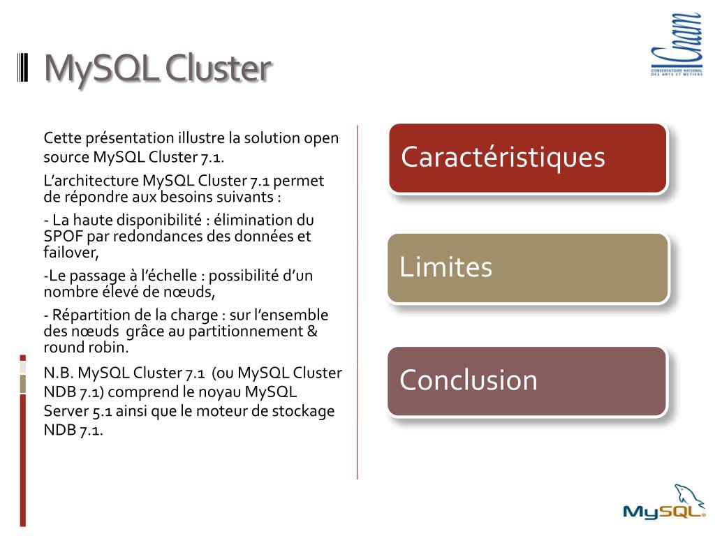 MySQL Cluster Cette présentation illustre la solution open source MySQL Cluster 7.1. L’architecture MySQL Cluster 7.1 permet de répondre aux besoins suivants : - La haute disponibilité : élimination du SPOF par redondances des données et failover, Le passage à l’échelle : possibilité d’un nombre élevé de nœuds, Répartition de la charge : sur l’ensemble des nœuds grâce au partitionnement & round robin. N.B. MySQL Cluster 7.1 (ou MySQL Cluster NDB 7.1) comprend le noyau MySQL Server 5.1 ainsi que le moteur de stockage NDB 7.1.