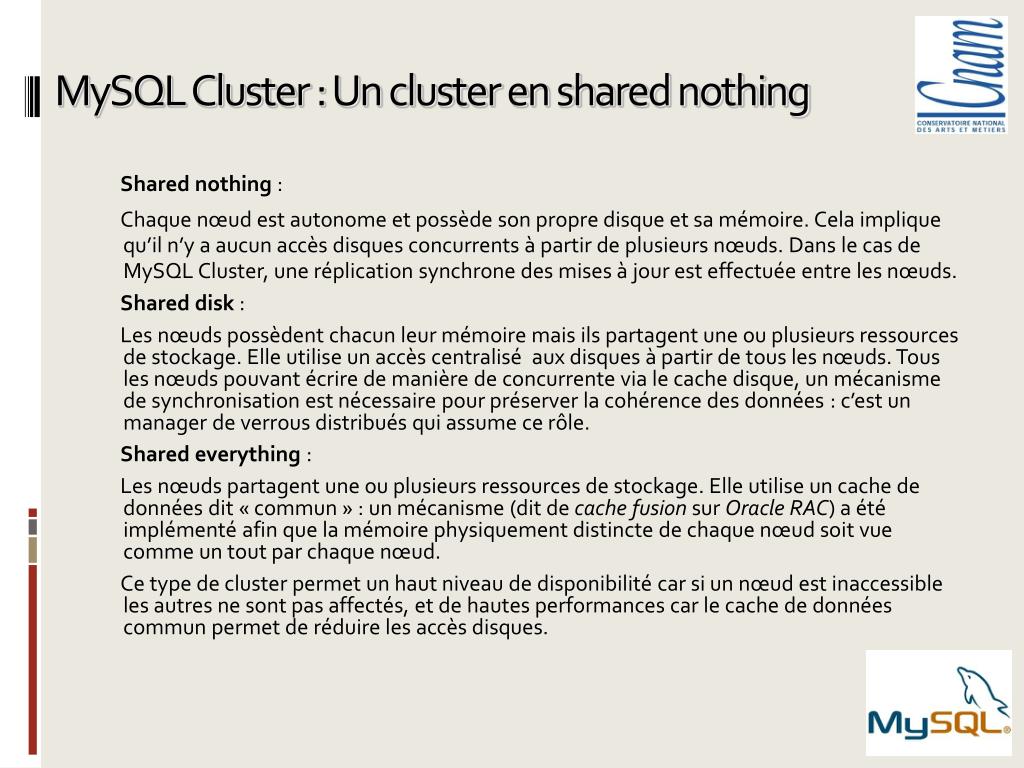 MySQL Cluster : Un cluster en shared nothing Shared nothing : Chaque nœud est autonome et possède son propre disque et sa mémoire. Cela implique qu’il n’y a aucun accès disques concurrents à partir de plusieurs nœuds. Dans le cas de MySQL Cluster, une réplication synchrone des mises à jour est effectuée entre les nœuds. Shared disk : Les nœuds possèdent chacun leur mémoire mais ils partagent une ou plusieurs ressources de stockage. Elle utilise un accès centralisé aux disques à partir de tous les nœuds. Tous les nœuds pouvant écrire de manière de concurrente via le cache disque, un mécanisme de synchronisation est nécessaire pour préserver la cohérence des données : c’est un manager de verrous distribués qui assume ce rôle. Shared everything : Les nœuds partagent une ou plusieurs ressources de stockage. Elle utilise un cache de données dit « commun » : un mécanisme (dit de cache fusion sur Oracle RAC) a été implémenté afin que la mémoire physiquement distincte de chaque nœud soit vue comme un tout par chaque nœud. Ce type de cluster permet un haut niveau de disponibilité car si un nœud est inaccessible les autres ne sont pas affectés, et de hautes performances car le cache de données commun permet de réduire les accès disques.