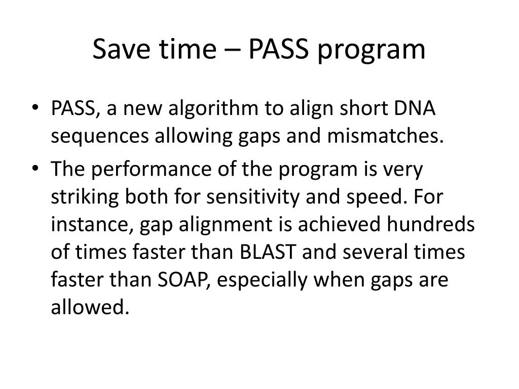 Save time – PASS program • PASS, a new algorithm to align short DNA sequences allowing gaps and mismatches. • The performance of the program is very striking both for sensitivity and speed. For instance, gap alignment is achieved hundreds of times faster than BLAST and several times faster than SOAP, especially when gaps are allowed.