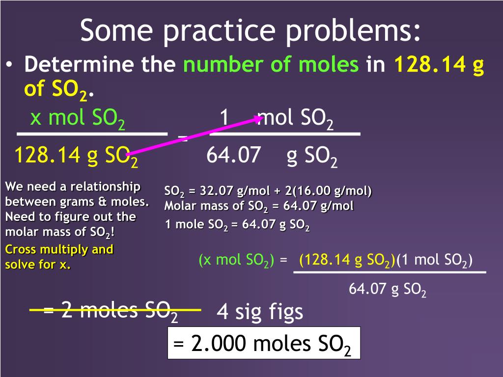 Some practice problems: • Determine the number of moles in 128.14 g of SO2.
