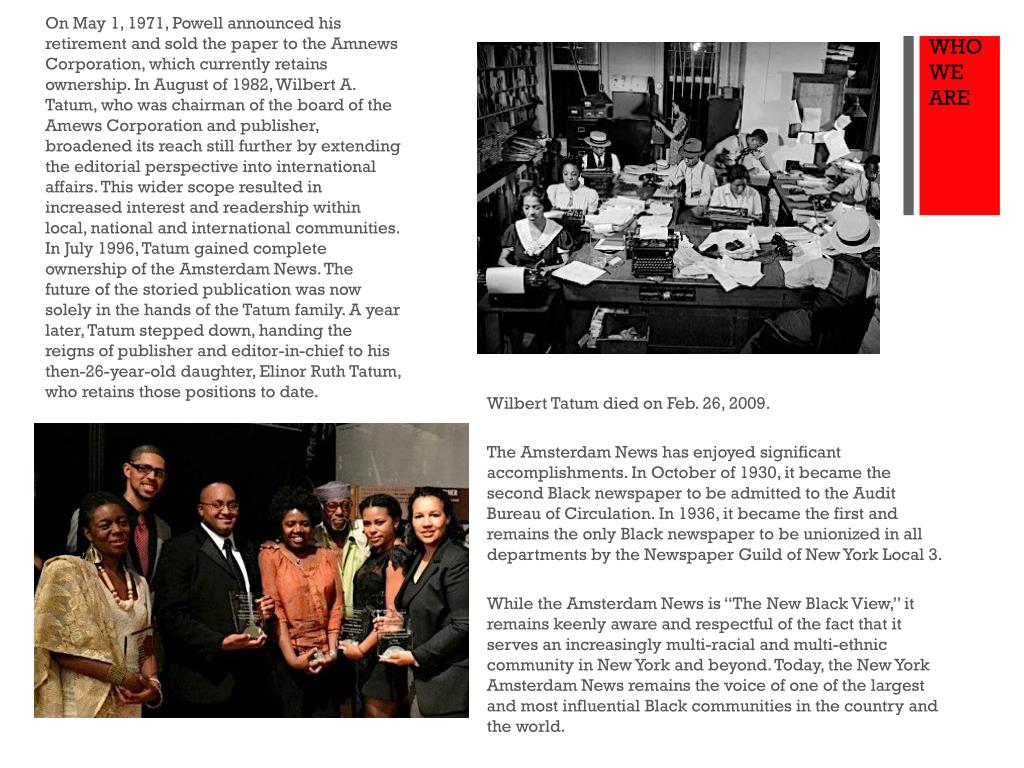 On May 1, 1971, Powell announced his retirement and sold the paper to the Amnews Corporation, which currently retains ownership. In August of 1982, Wilbert A. Tatum, who was chairman of the board of the Amews Corporation and publisher, broadened its reach still further by extending the editorial perspective into international affairs. This wider scope resulted in increased interest and readership within local, national and international communities. In July 1996, Tatum gained complete ownership of the Amsterdam News. The future of the storied publication was now solely in the hands of the Tatum family. A year later, Tatum stepped down, handing the reigns of publisher and editor-in-chief to his then-26-year-old daughter, Elinor Ruth Tatum, who retains those positions to date. WHO WE ARE Wilbert Tatum died on Feb. 26, 2009. The Amsterdam News has enjoyed significant accomplishments. In October of 1930, it became the second Black newspaper to be admitted to the Audit Bureau of Circulation. In 1936, it became the first and remains the only Black newspaper to be unionized in all departments by the Newspaper Guild of New York Local 3. While the Amsterdam News is “The New Black View,” it remains keenly aware and respectful of the fact that it serves an increasingly multi-racial and multi-ethnic community in New York and beyond. Today, the New York Amsterdam News remains the voice of one of the largest and most influential Black communities in the country and the world.