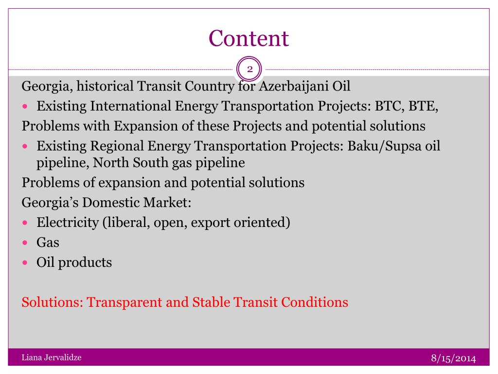 Transit Country- Case Georgia. Liana Jervalidze Expert on Energy and Regional Issues International School of Caucasus Studies, Ylia State University Kiev, November 5 2010,. Content. Georgia, historical Transit Country for Azerbaijani Oil