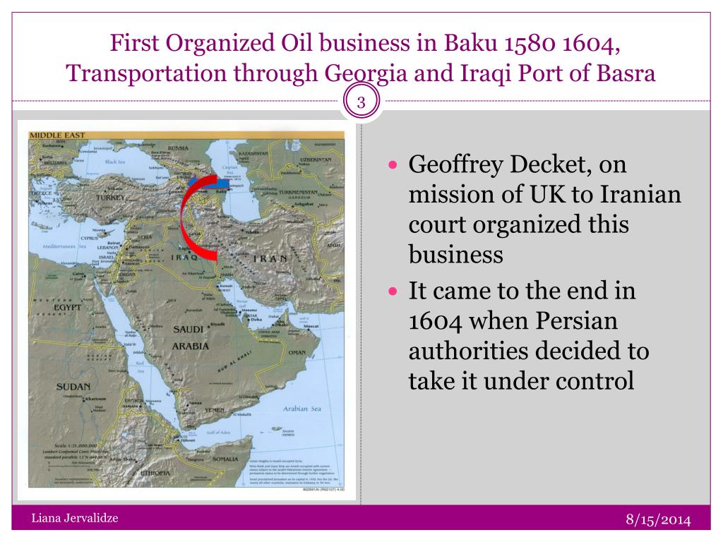 First Organized Oil business in Baku 1580 1604, Transportation through Georgia and Iraqi Port of Basra • Geoffrey Decket, on mission of UK to Iranian court organized this business • It came to the end in 1604 when Persian authorities decided to take it under control Liana Jervalidze