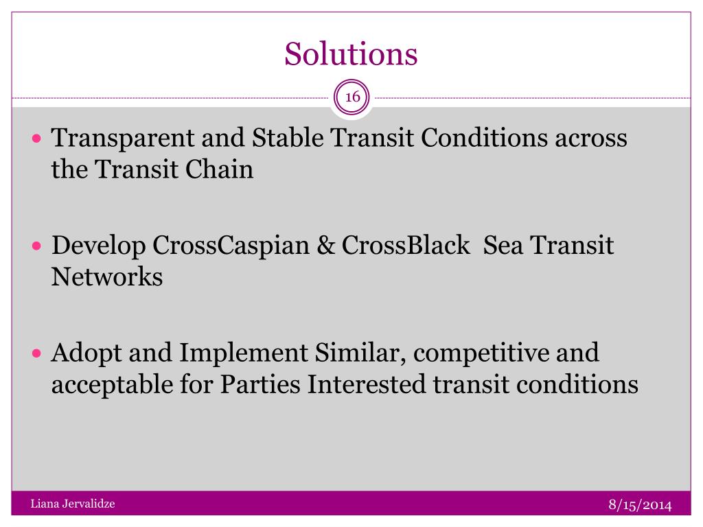 Solutions • Transparent and Stable Transit Conditions across the Transit Chain • Develop CrossCaspian & CrossBlack Sea Transit Networks • Adopt and Implement Similar, competitive and acceptable for Parties Interested transit conditions Liana Jervalidze